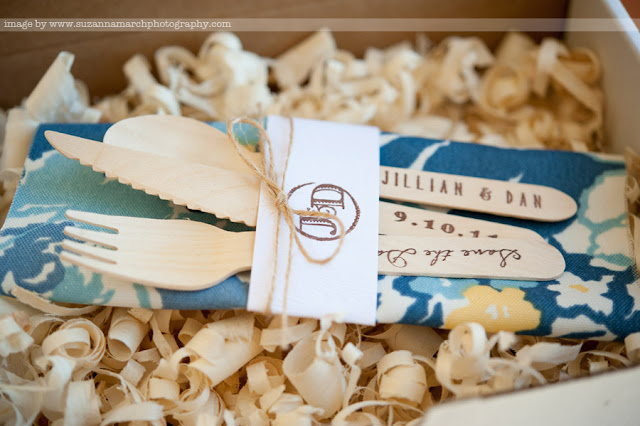 A colorful napkin, wrapped in a wood grain embossed belly band, tied with twine and we are good to go!